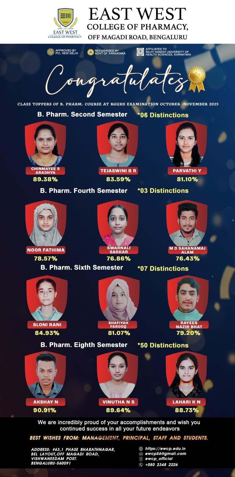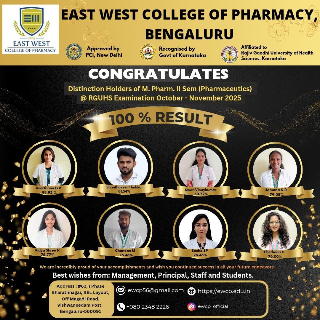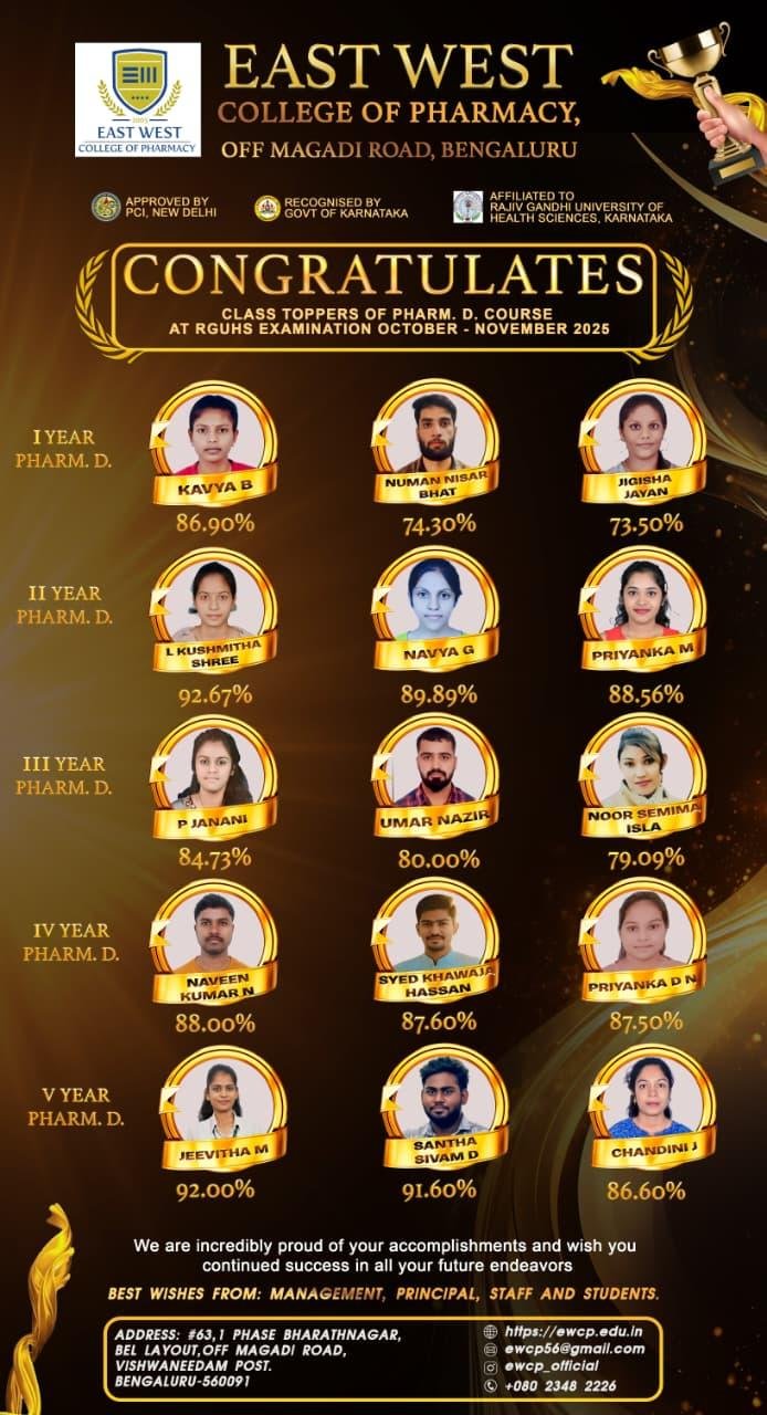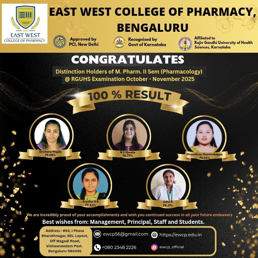East West College of Pharmacy, a unit of East West Group of Institutions was established in the year 1992 by renowned educationist & philanthropist, Late Shri. C M Nagaraj who envisioned providing a matchless opportunity to all the aspirants of Pharmacy Education. EWCP is one of the reputed and highly valued institutes in the State of Karnataka and has earned a formidable reputation across the globe with its academic standards. Our alumni spread across the world and occupy enviable positions in academia and industry. Our college provides equal opportunity for everyone to conduct research and supports higher education and entrepreneurship